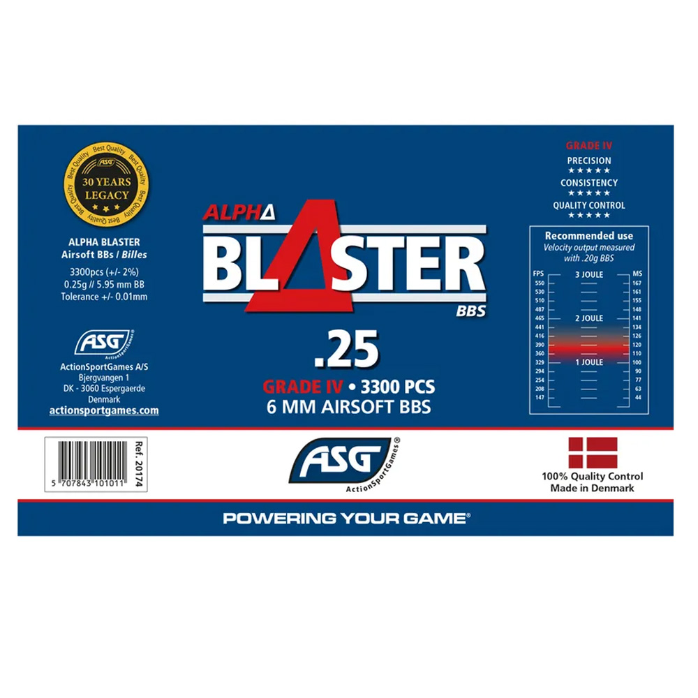 Alpha Blaster 0.25g är noggrant konstruerad efter våra tuffaste toleranser för att ge precision utan motstycke. Varje kula är tillverkad för att bete sig exakt likadant som den föregående — det är skillnaden mellan träff och bom, mellan att vinna och att förlora. ActionSportGames välkända kvalitetskontroll i Danmark garanterar konsekvens: när du väljer Alpha Blaster får du BB’s du verkligen kan lita på.