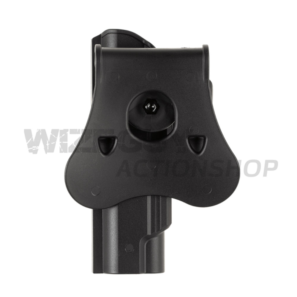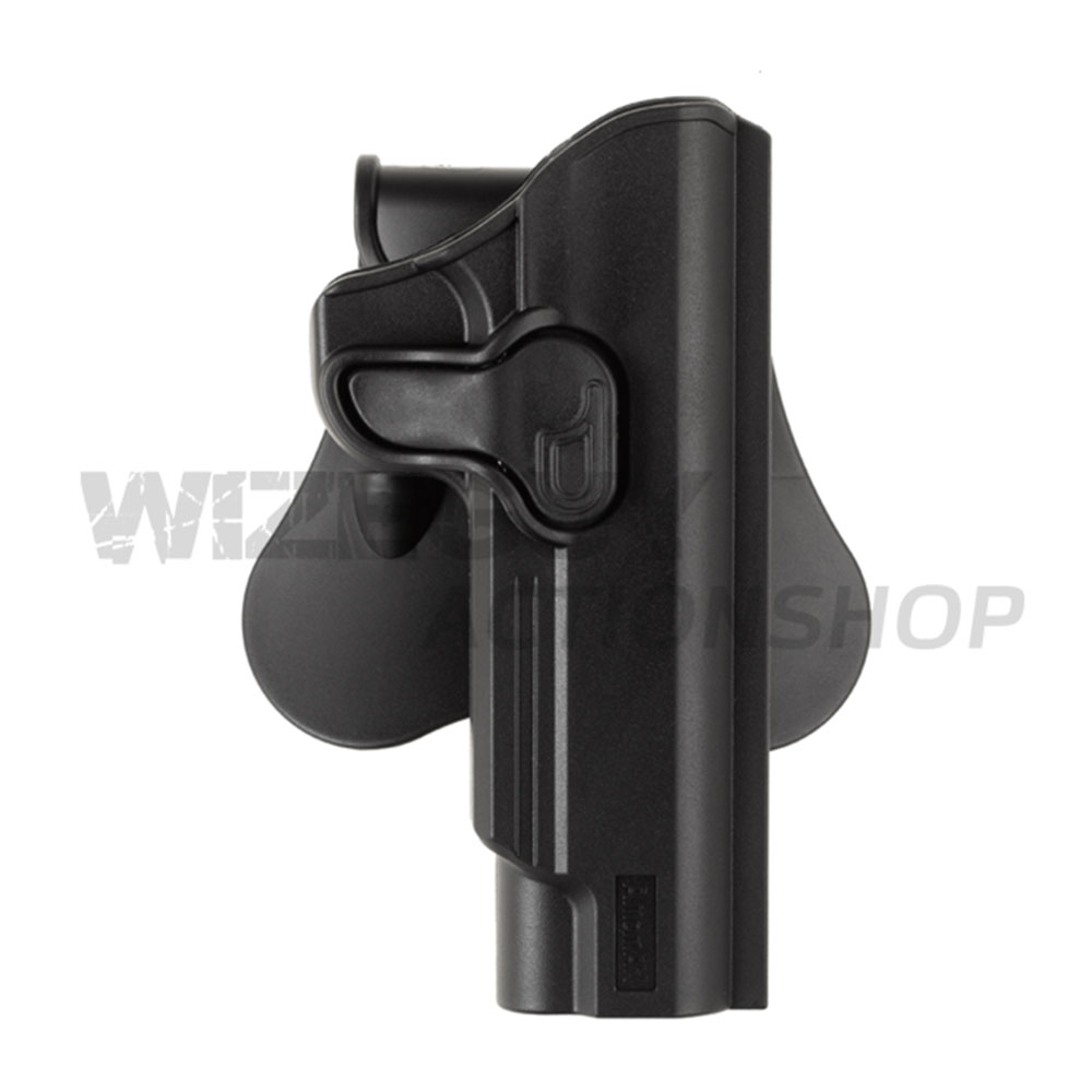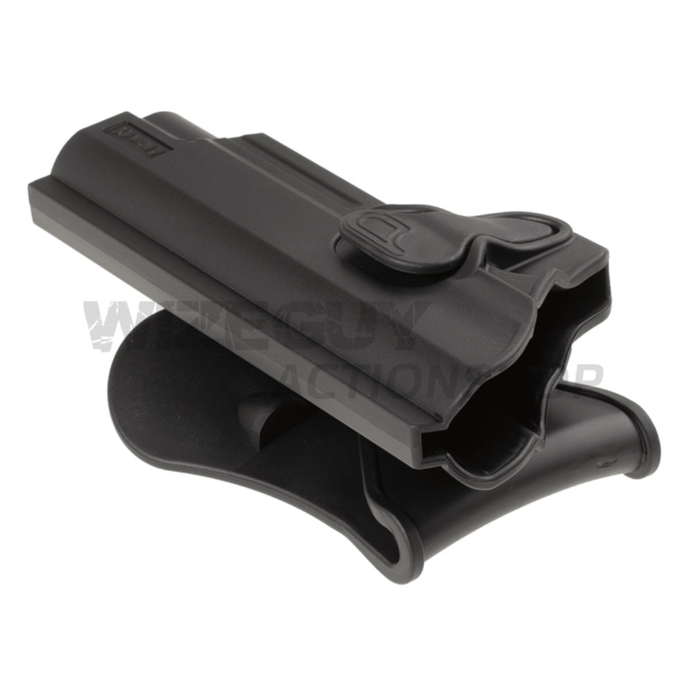 AMOMAX Polymer-hölster är utformade för att fungera smidigt och enkelt med Colt 1911 Airsoft-vapen utan rail, och ger snabb åtkomst till vapnet när det behövs. Med en roterbar hållare och utbytbara fästen, är hölstret mångsidigt och kan bäras på olika sätt för att passa användarens behov. Hölstret levereras med en paddelfäste som fäster direkt i bältet eller byxlindningen.