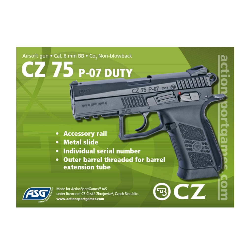 CZ 75 P-07 Duty är den nya generationen i CZ 75 familjen som först designades under 1975 av den världskända vapentillverkaren Česká Zbrojovka i Tjeckien. CZ 75 P-07 Duty är en kompakt taktisk pistol och har en integrerad främre 22mm rail för tillbehör som laser och vapenlampa. Ytterpipan har 12mm invändiga gängor för montering av ljuddämpare. Greppet och metallmanteln har den äkta CZ märkningen och varje pistol har sitt egna unika serienummer. Denna pistol med non-blowback drivs med en 12g Co2 patron som döljs i greppet tackvare dess enkla laddsystem.