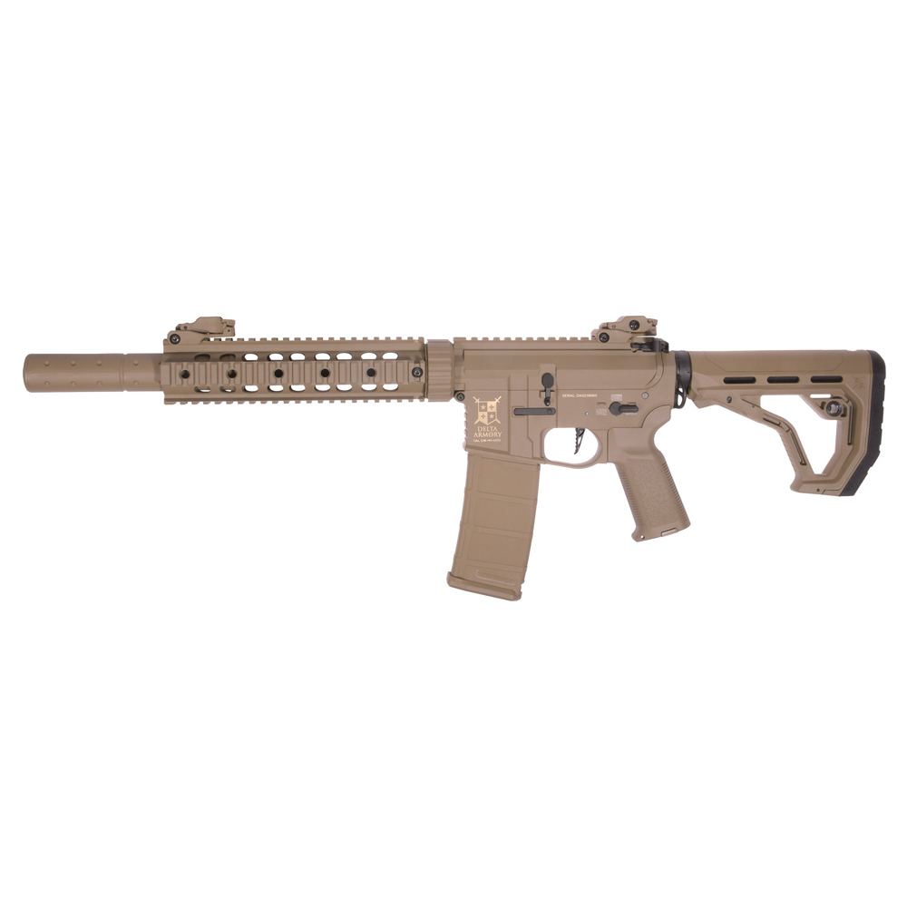 Picatinny system som gör det enkelt att montera standard tillbehör. På detta gevär sitter även en ljuddämpare monterad direkt från fabrik. Modernt airsoft M4 elektriskt gevär från Delta Armory. Geväret kommer med fabriksmonterad ETU/MosFet som styr avtryckaren elektroniskt. Charlie modellerna är tillverkade i kraftig polymer. Så du får ett gevär som håller riktigt bra och känns väldigt stabilt. Samtidigt som priset är väldigt lågt och vikten också lägre än många likvärdiga gevär.