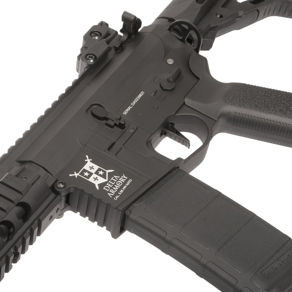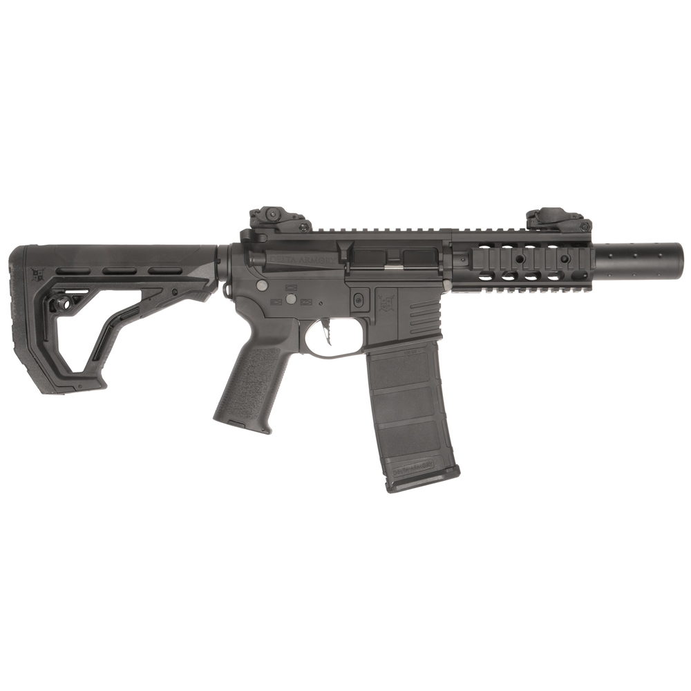 CQB M4 gevär i full metall med fabriksmonterad ljuddämpare. Modernt airsoft M4 elektriskt gevär i full metall från Delta Armory. Geväret kommer med fabriksmonterad ETU/MosFet som styr avtryckaren elektroniskt. Alpha modellerna är tillverkade i full metall. Så du får ett gevär som håller riktigt bra och känns väldigt verkligt. Samtidigt som Delta Armory lyckats hålla nere priset. Så du får väldigt mycket gevär för pengarna. Hög kvalité i full metall till lågt pris.