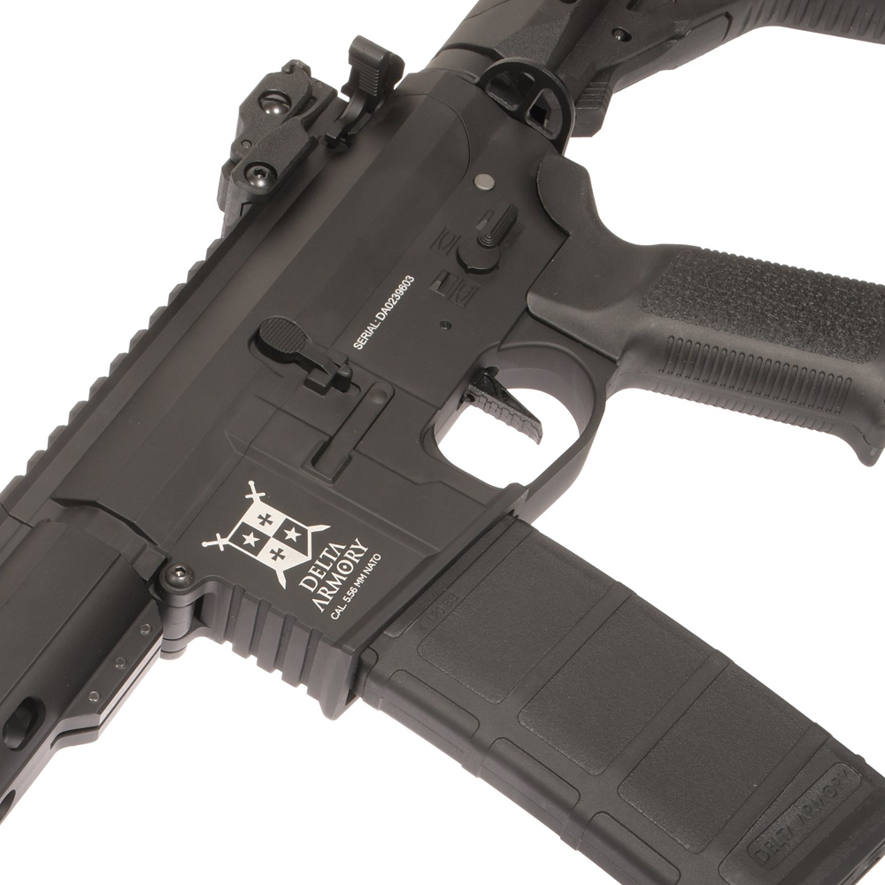 DMR M4 med Keymod handguard. Modernt airsoft M4 elektriskt gevär i full metall från Delta Armory. Geväret kommer med fabriksmonterad ETU/MosFet som styr avtryckaren elektroniskt. Alpha modellerna är tillverkade i full metall. Så du får ett gevär som håller riktigt bra och känns väldigt verkligt. Samtidigt som Delta Armory lyckats hålla nere priset. Så du får väldigt mycket gevär för pengarna. Hög kvalité i full metall till lågt pris.