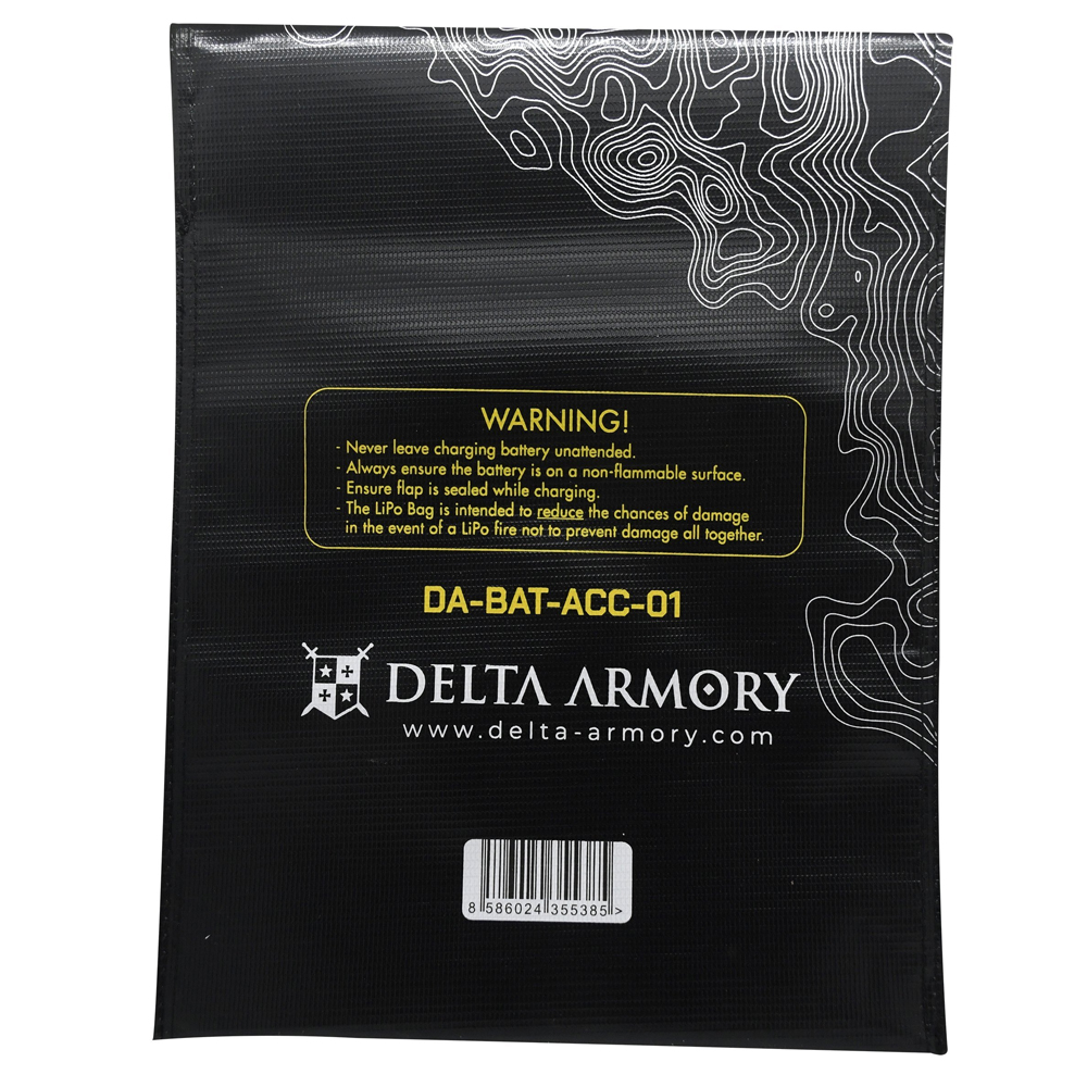 Delta Armory LiPo Safety Bag är en brandsäker och explosionshämmande påse designad för att skydda både dig och din omgivning vid laddning, förvaring eller transport av LiPo-batterier. Påsen är tillverkad för att minimera riskerna vid kortslutning, överladdning eller fysisk skada på batteriet.