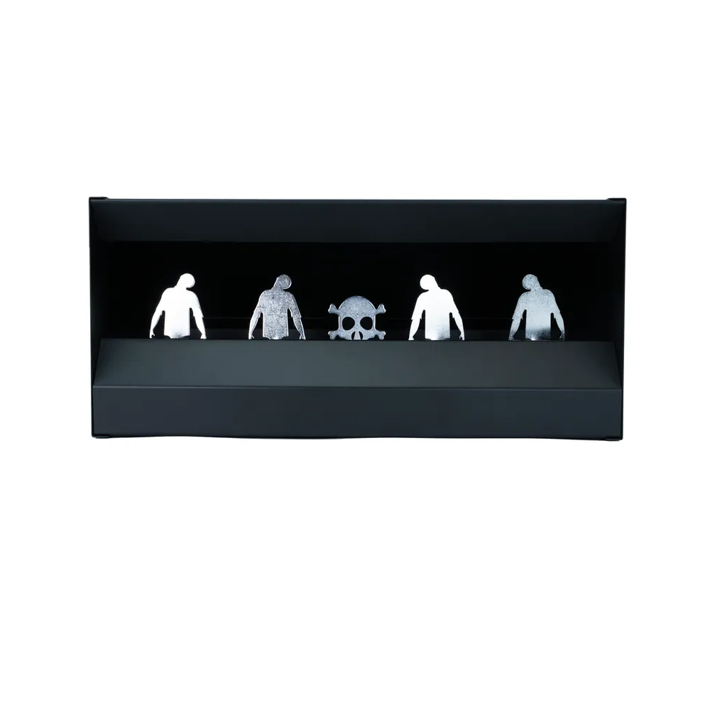 Gör luftvapenträningen roligare än någonsin med denna zombietema-måltavla i metall! Här får du fyra reaktiva mål i form av zombies – och en dödskalle i mitten som återställer allt när du träffar den. Perfekt för prickskytte med extra underhållning.