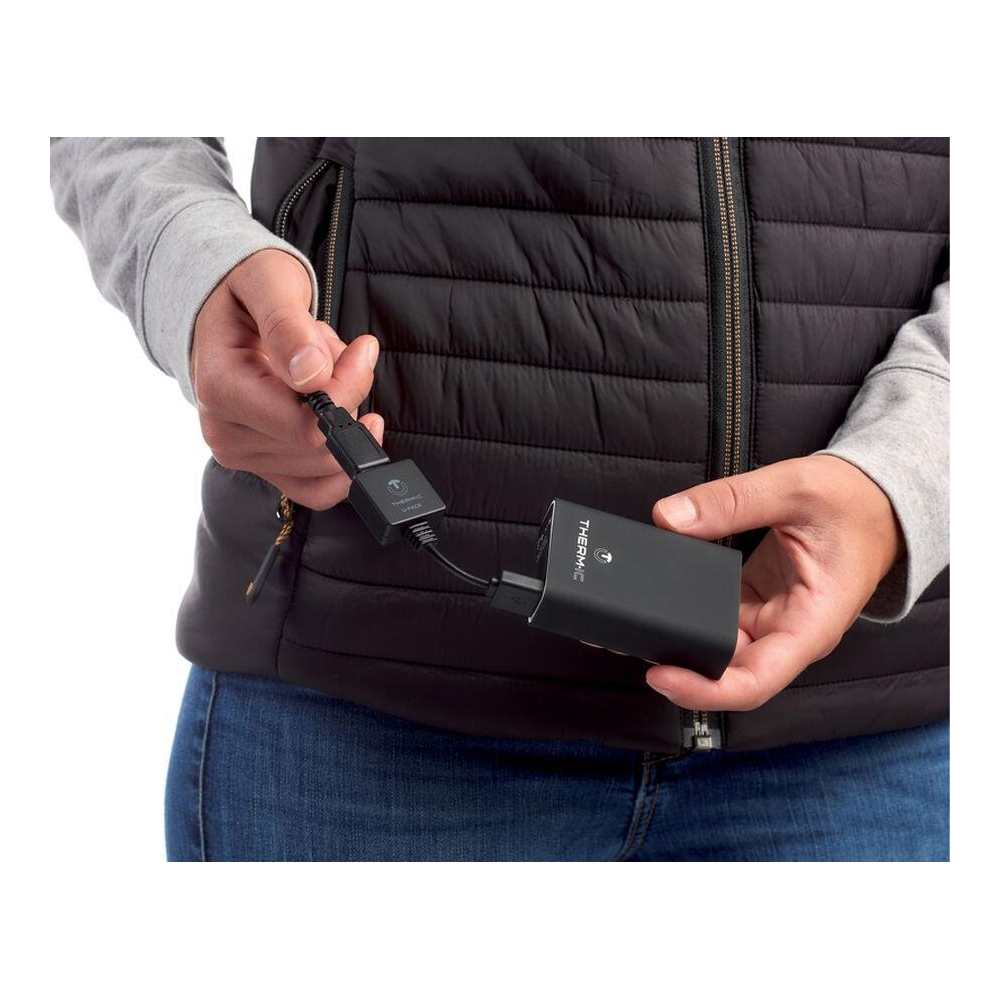 Tillsammans med västen levereras 1st Therm-Ic U-pack USB-kabel. USB-kabeln låter dig aktivera Therm-Ic västens Bluetooth® så du kan styra värmefunktionen via Therm-Ic’s app som du hittar där appar finns. Notera att när västen inte är ansluten till appen kommer värmekraften att vara på maxvärme, men genom att ansluta jackan till appen kan du styra uppvärmningen genom att välja en lämplig inställning och därigenom få önskad värme och längre batteritid.
